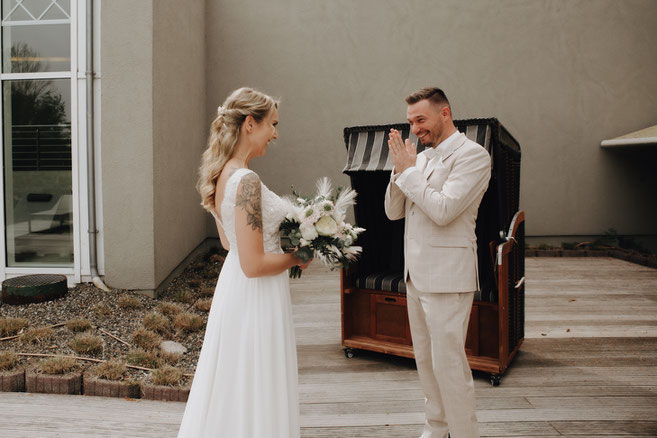 Egal wie ihr euren first look gestalten wollt, ob erst bei der Trauung, an einer ausgewählten Location vor allen anderen oder direkt bei euch vor der Haustür. Dieser Moment ist einfach magisch! Wenn sich das Brautpaar das erste Mal sieht, fließt schon mal die ein oder andere Träne und die Emotionen die ihr in genau diesem kleinen Moment fühlt, die euch in diesem kleinen Moment ins Gesicht geschrieben stehen, möchte ich am festhalten, damit ihr genau das wieder fühlt, wenn ihr euch eure Bilder anschaut.