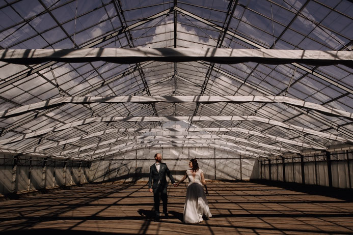 Mit meinem geschulten Auge mache ich für euch die besten Fotospots aus. So wie hier, als wir auf dem Weg zu einer Fotolocation an vielen Gewächshäuser vorbeigekommen sind. Kurzerhand hab ich dem Brautpaar diesen Spot vorgeschlagen- wir haben natürlich gefragt- und durften diese traumhaften und wirklich außergewöhnlichen Bilder machen.